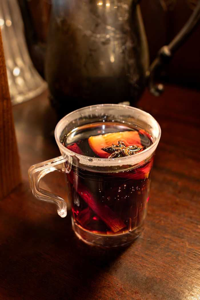 The good drink in question? The holiday Glühwin, of course. Made with cabernet sauvignon, ruby port, raspberry himbeergeist, orange juice, honey syrup, ginger, allspice, nutmeg, and clove, this drink is exactly what you need to get into the holiday spirit!