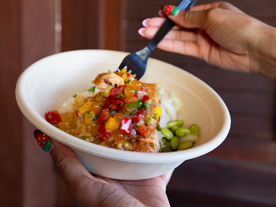 Island Chicken Salad – OK, this really is something to get if you’re looking for a light and fresh option on a hot day. (Or if you’re trying to hit your protein goals like me.) Grab this portable lunch of diced chicken, apples, grapes, and almonds in a creamy coconut dressing. Plus, it comes with more fruit! Your doctor will be proud.